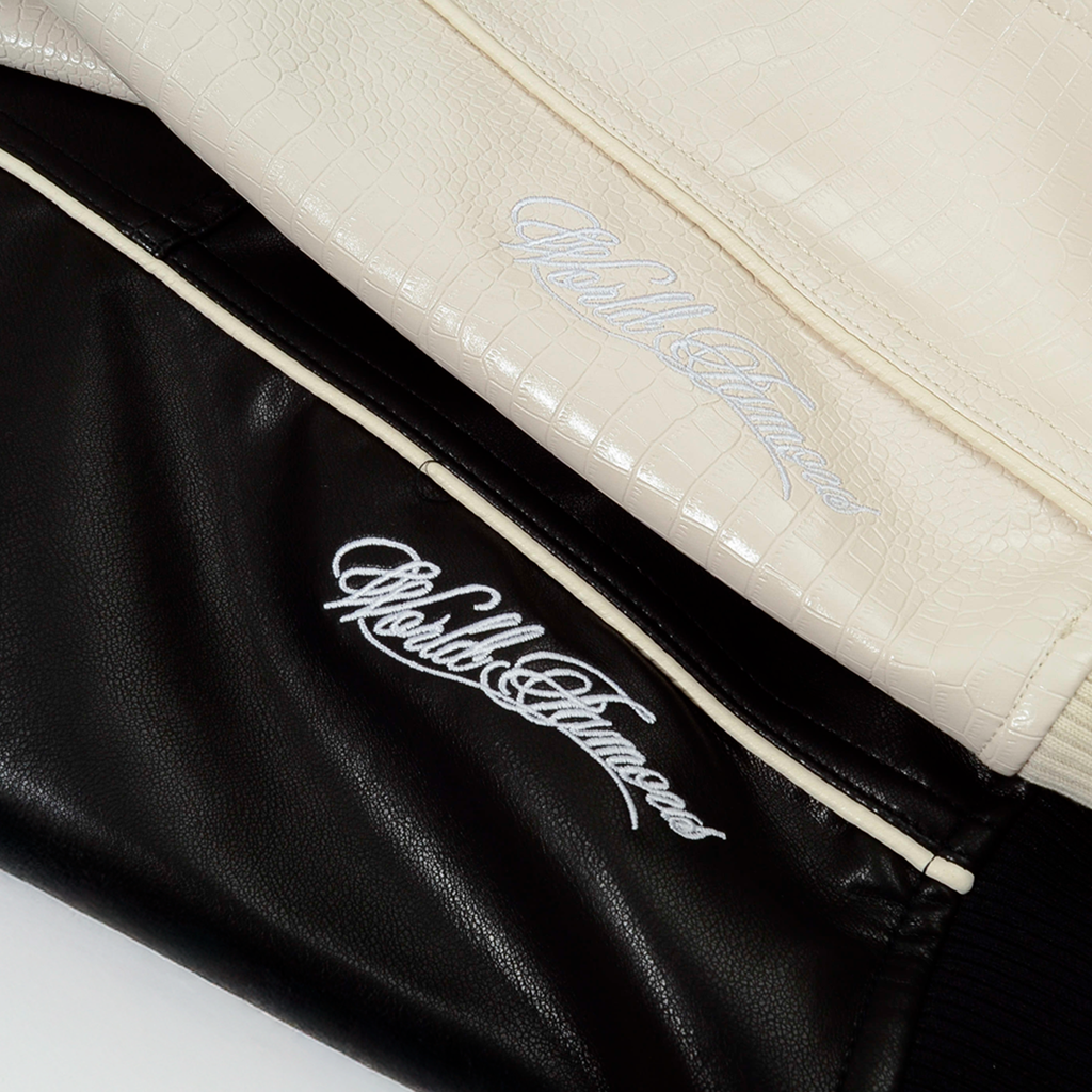 Com construção robusta em couro premium e acabamento em lã no estilo varsity, a peça traz aquele visual universitário clássico com a pegada agressiva das ruas. Os detalhes bordados nos braços e costas mostram que cada centímetro da jaqueta carrega a identidade de duas das maiores referências da cultura urbana.