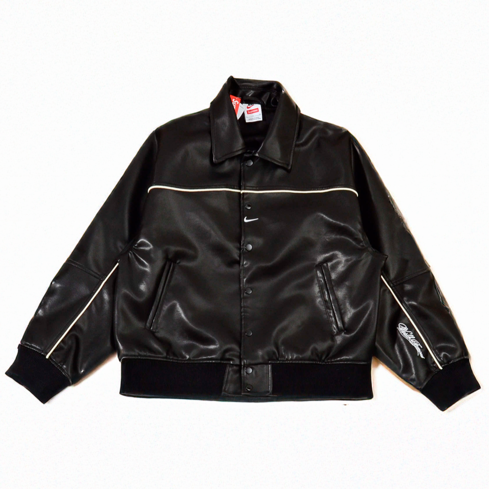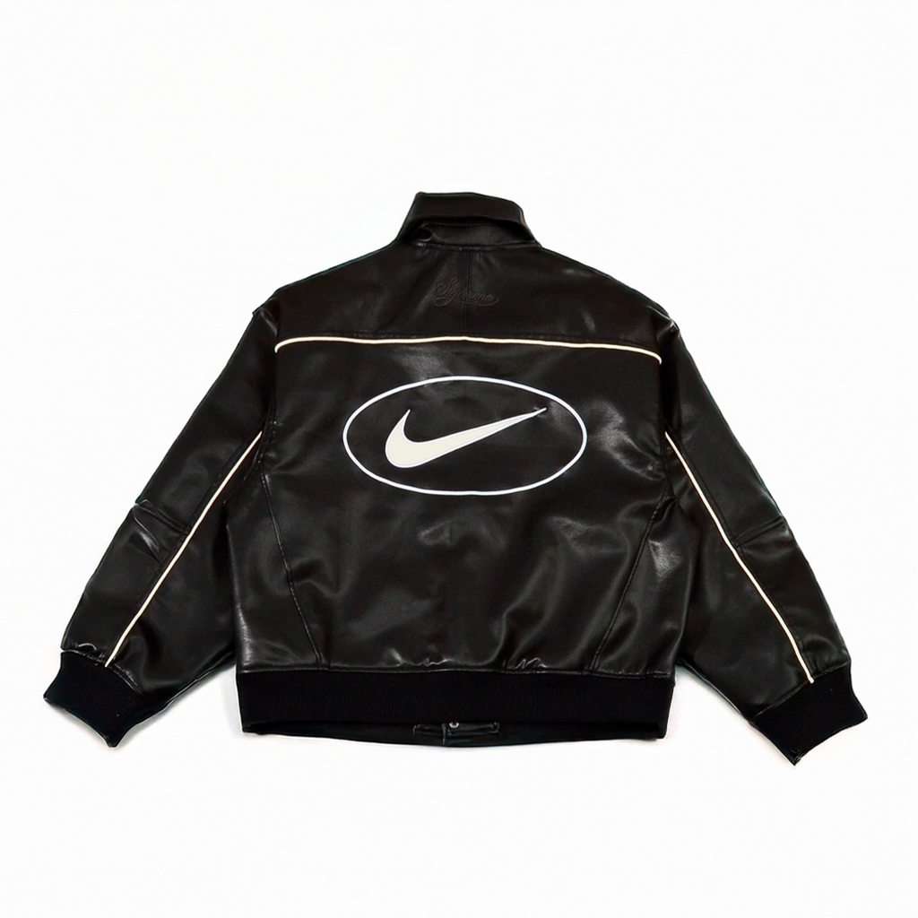 Quando a Supreme se junta à Nike, o resultado é mais do que collab é história no streetwear. A Varsity Leather Jacket Black entrega peso, atitude e um design que respira autenticidade.