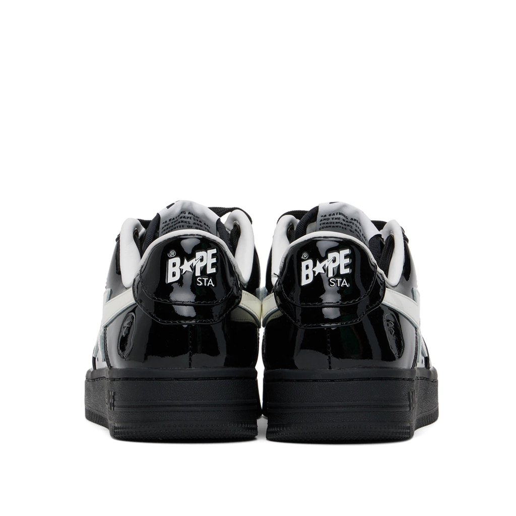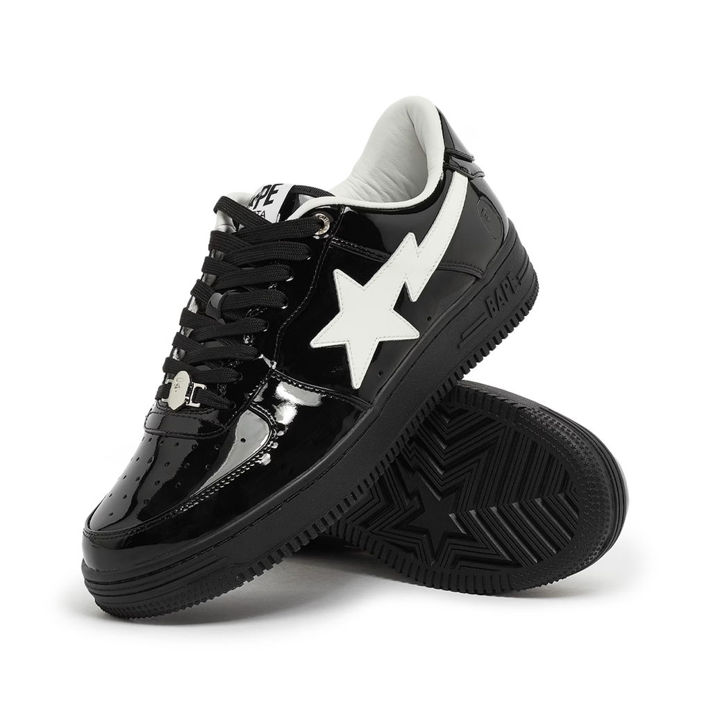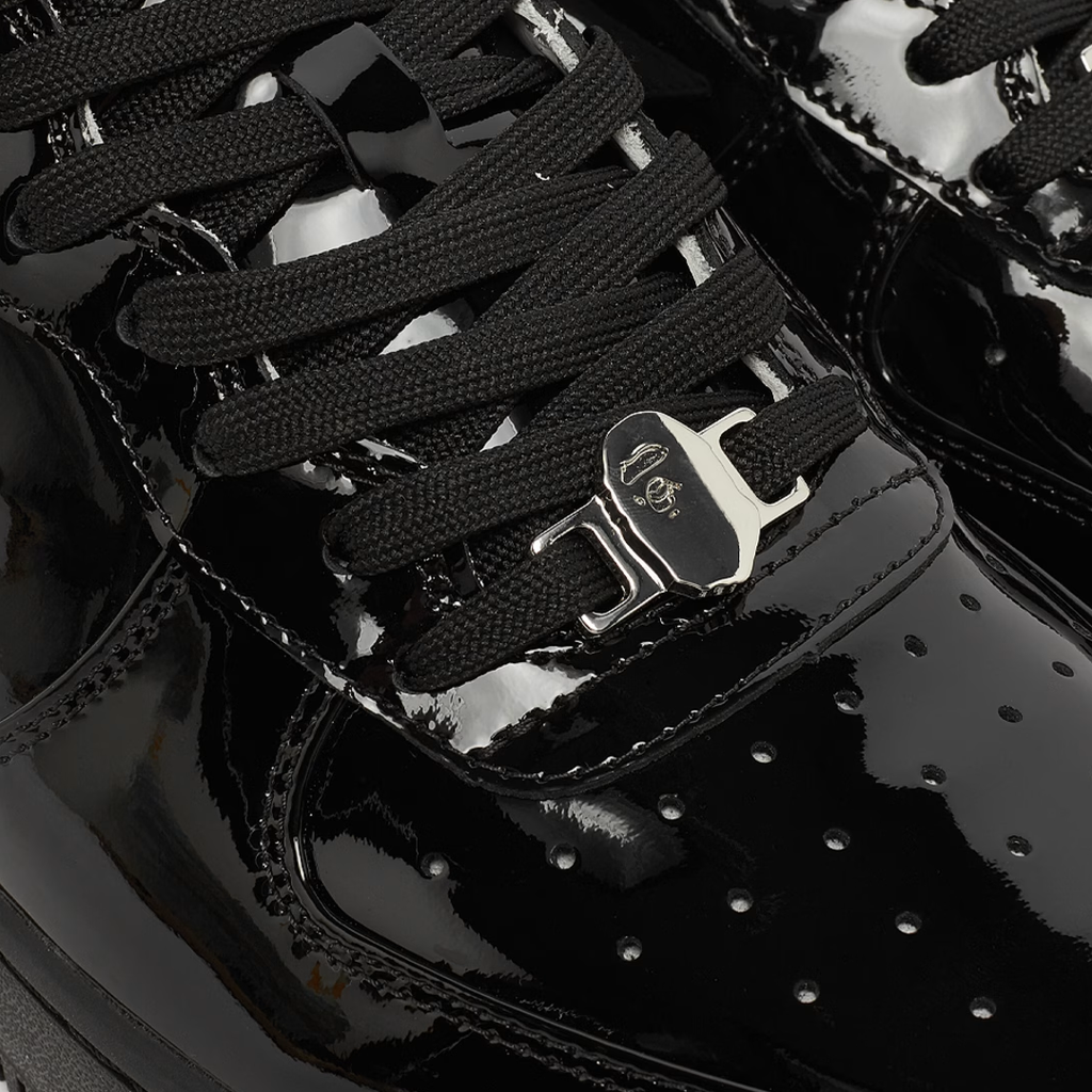 O design do Bape Sta #2 Black Patent destaca-se pelo seu cabedal em couro envernizado preto brilhante, contrastando com o icônico "Sta" branco em formato de estrela nas laterais e o raio que o acompanha. Detalhes como a perfuração na biqueira e o branding BAPE na entressola completam a silhueta distintiva, que transcende o esporte e a moda.