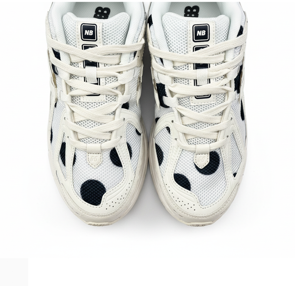 A New Balance 1906R Polka Dot White/Black representa uma das evoluções mais gráficas da icônica silhueta dad shoe, estabelecendo nova linguagem visual através de padrões experimentais contemporâneos.