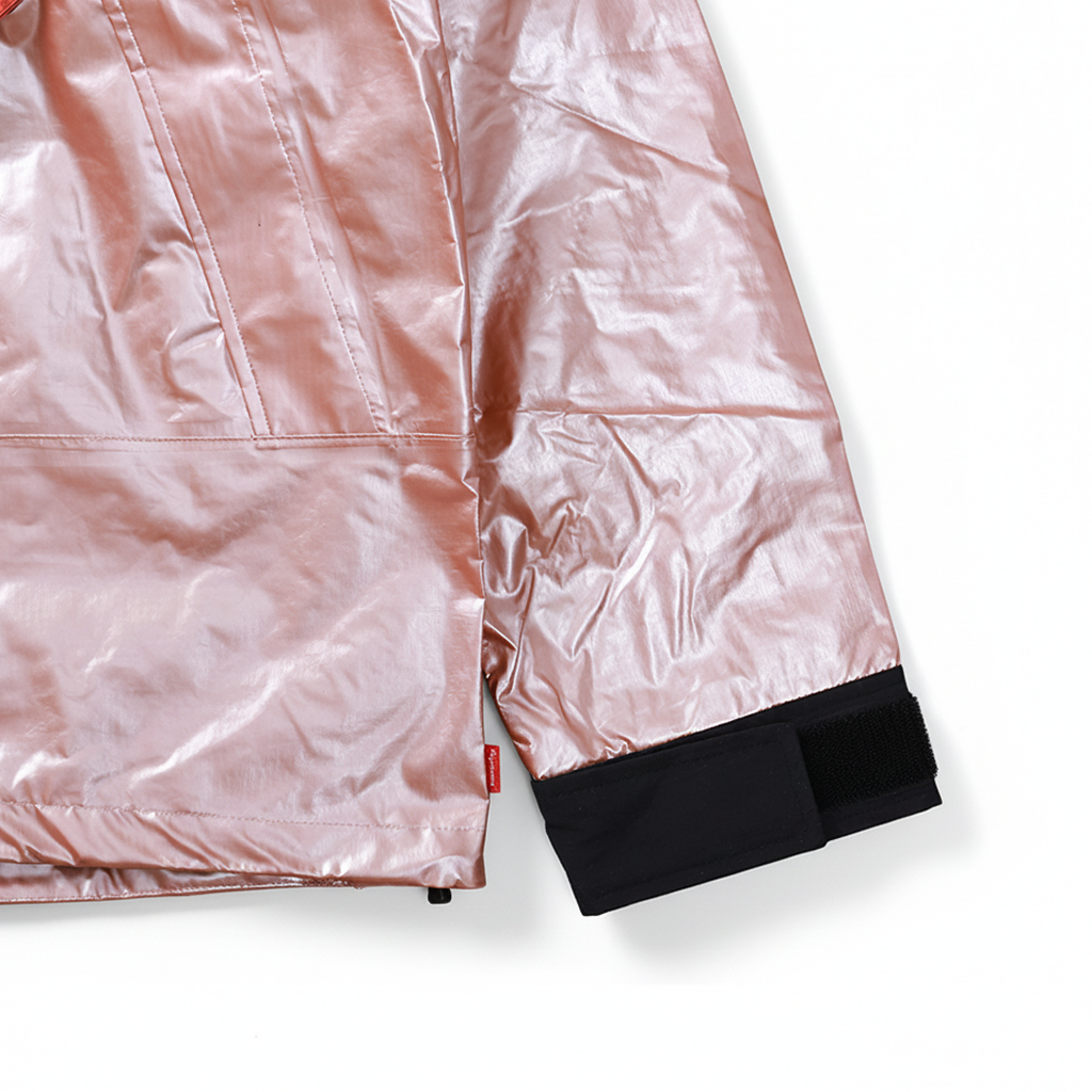 Construída em nylon ripstop com fully seam-sealed construction, esta Mountain Parka utiliza tecnologia waterproof que garante proteção total contra intempéries. O acabamento metallic rose gold é aplicado através de processo PU coating que mantém flexibilidade e durabilidade do tecido. A estrutura lightweight permite mobilidade irrestrita, enquanto os snap buttons frontais e zíperes YKK oferecem fechamento duplo para máxima vedação contra vento e chuva.