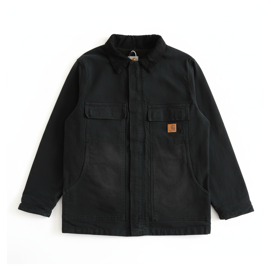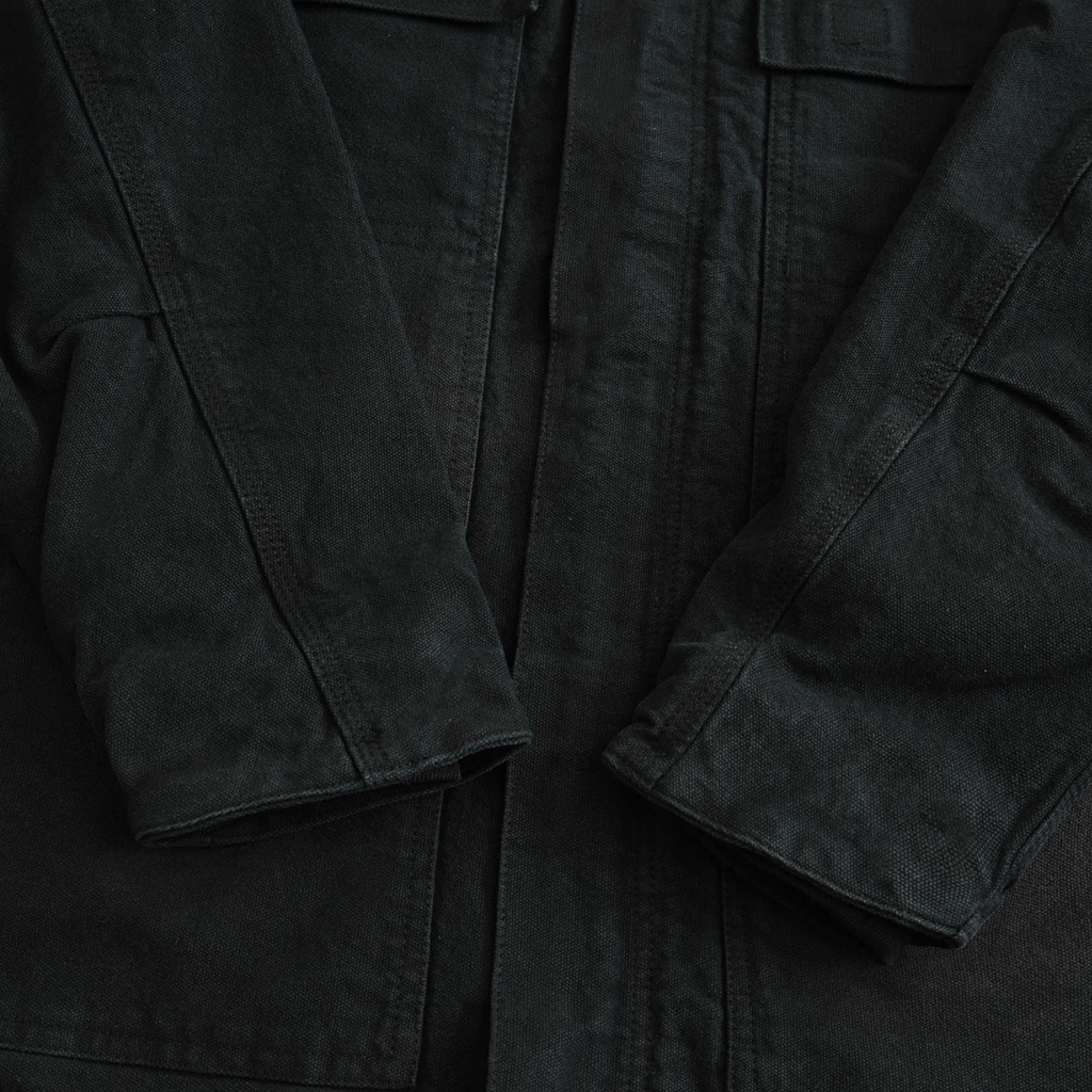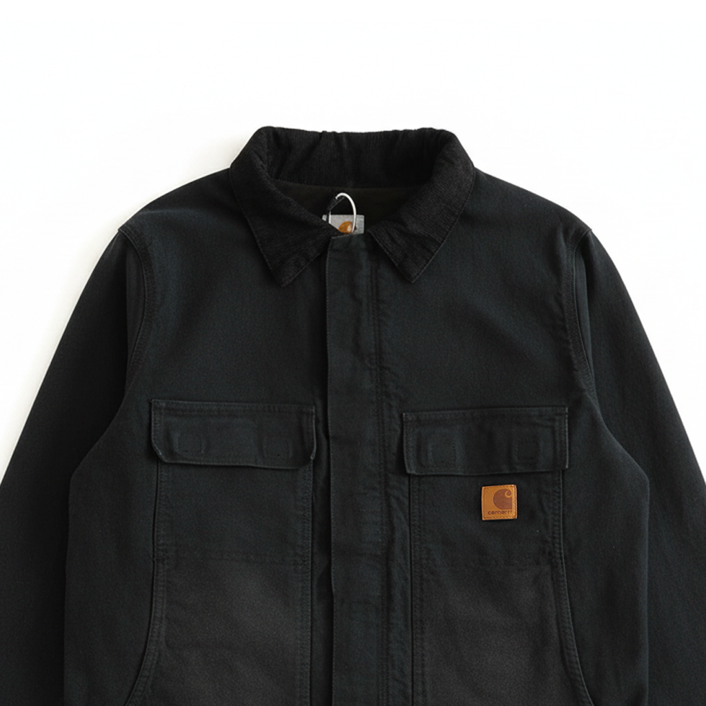 O design clássico apresenta colorway barn black com desbotamento natural característico do vintage, featuring chest pockets duplos com flap, lower front pockets amplos, inside pocket interno, corduroy collar com under-collar snaps funcionais, e acabamento em costura tripla com reforços riveted nos pontos principais de tensão.