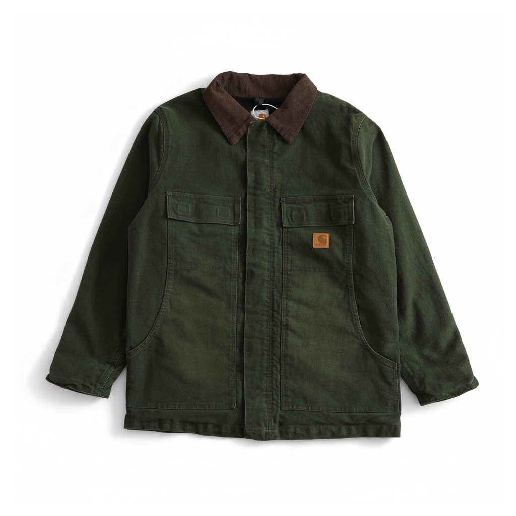 O design clássico apresenta colorway barn green com desbotamento natural característico do vintage, acompanhando chest pockets duplos com flap, lower front pockets amplos, inside pocket interno, corduroy collar com under-collar snaps funcionais, e acabamento em costura tripla com reforços riveted nos pontos principais de tensão.